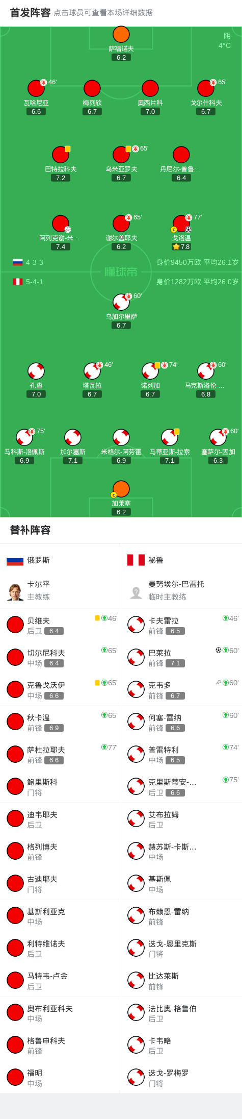北京时间11月13日国际友谊赛,俄罗斯与秘鲁展开对决。比赛中,阿列克谢-米兰丘克送出助攻,戈洛温破门得分,为俄罗斯取得领先。随后,克韦多助攻巴莱拉攻入一球,帮助秘鲁扳平比分。最终双方以1比1握手言和。