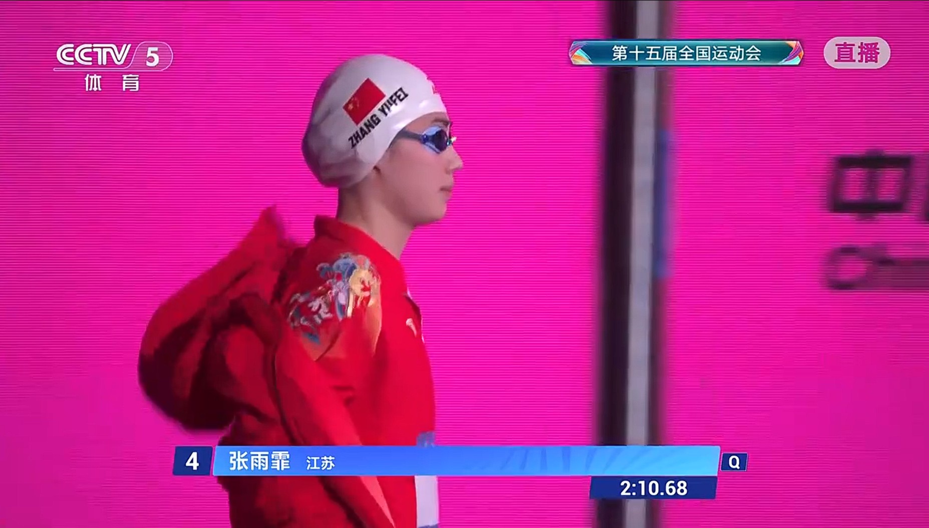 11月13日,全运会游泳女子200米蝶泳半决赛,13岁的河北小将于子迪2分07秒95排名半决赛第一,张雨霏2分08秒34排名第二,顺利晋级决赛。