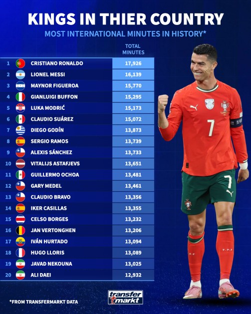 北京时间11月13日,德转统计出了自他们开始收集相关数据以来,在国家队层面出场时间最多20名球员,C罗以17926分钟 高居第一,梅西16139分钟位列第二,榜单上还包括了布冯、莫德里奇、戈丁、拉莫斯、桑切斯、卡西利亚斯、维尔通亨、洛里以及阿里代伊等名将。