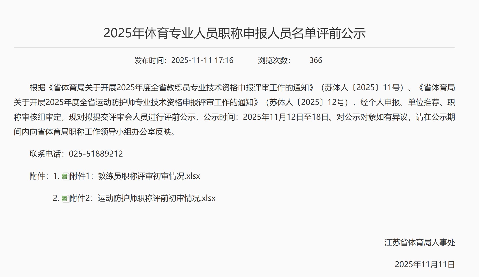 11月11日,江苏省体育局人事处发布了《2025年体育专业人员职称申报人员名单评前公示》。张雨霏拟评为游泳国家级教练,张常宁拟评为排球国家级教练。