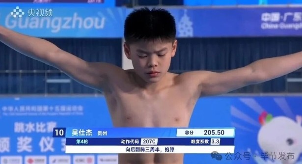 据报道,11月11日,第十五届全国运动会跳水比赛男子10米跳台决赛中,12岁小将吴仕杰取得第八名的好成绩,成功创造贵州运动员在该项目上的历史最佳成绩。