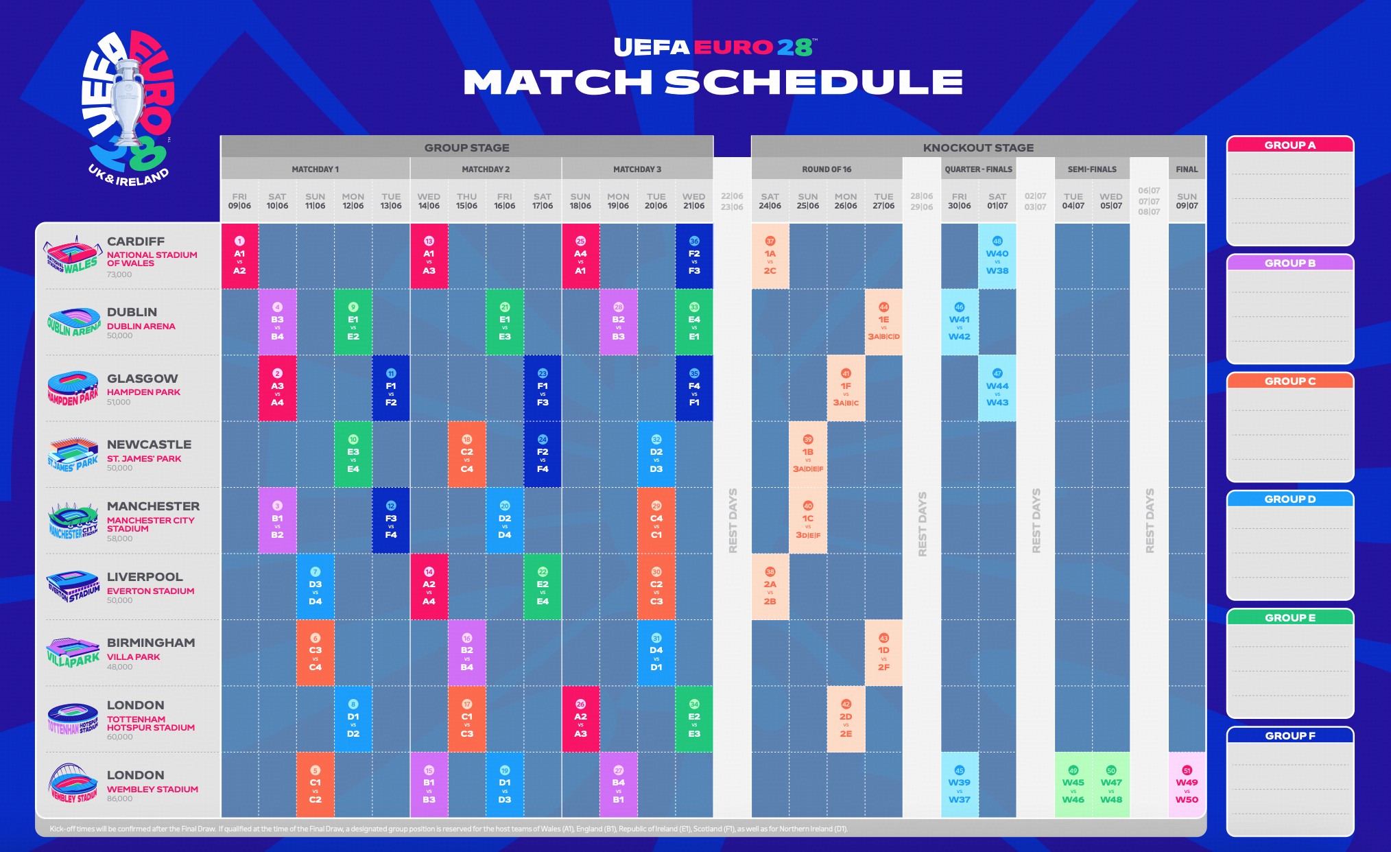 北京时间11月13日凌晨,2028年欧洲杯赛程确定。2028年欧洲杯将在英格兰、苏格兰、威尔士、爱尔兰八座城市的9座球场进行,比赛揭幕时间在2028年6月9日,揭幕战将在卡迪夫的威尔士国家体育场进行。