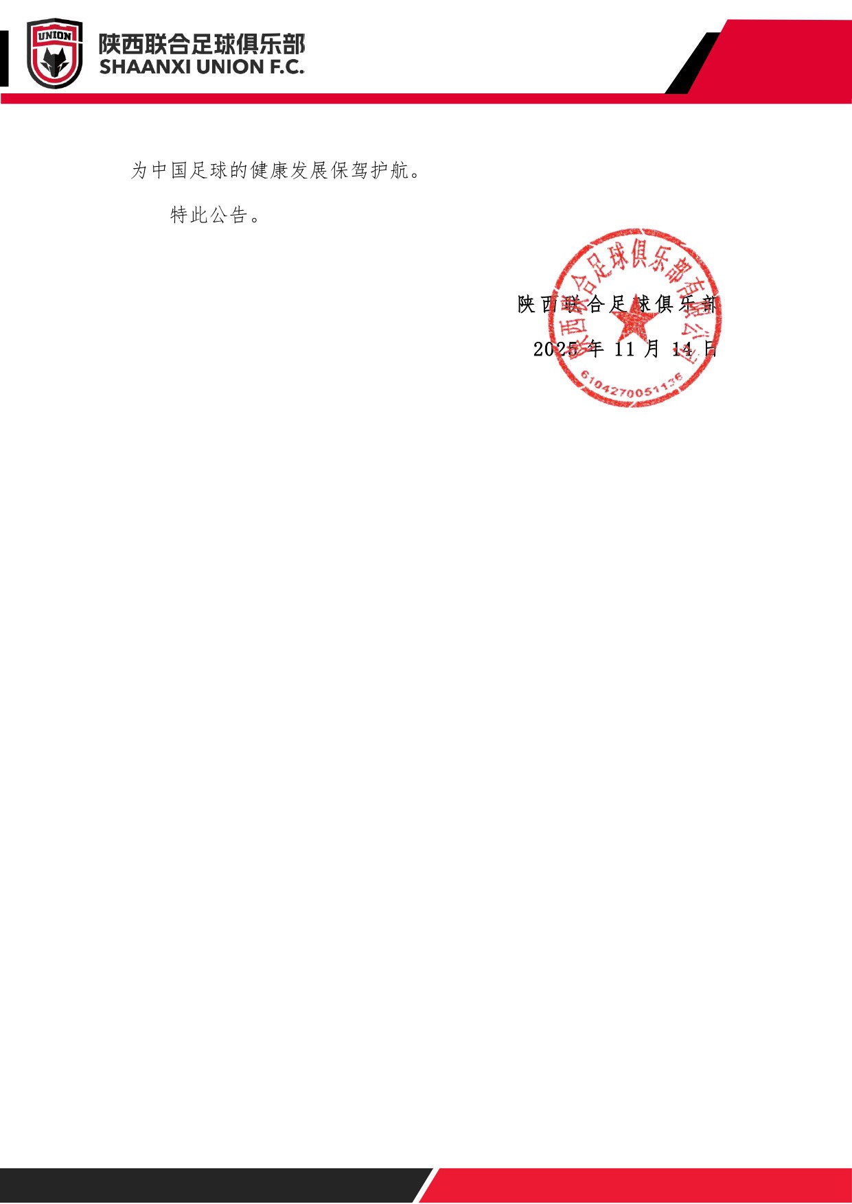 陕西联合在公告中称,俱乐部将严格按照程序积极准备应诉,依法依规维护自身合法权益。同时俱乐部认为,此次纠纷所依据的“主体继承”逻辑极度不合理,中国足协至今未出台任何关于足球俱乐部体育继承相关官方文件。这种缺乏明确规则的判断逻辑,严重违背公平公正原则,还将给中国各级俱乐部的生存发展带来极大的不确定性,将大幅增加行业经营风险,打击投资信心,严重破坏中国足球职业联赛的健康生态,对中国足球行业的长远发展造成不良影响。