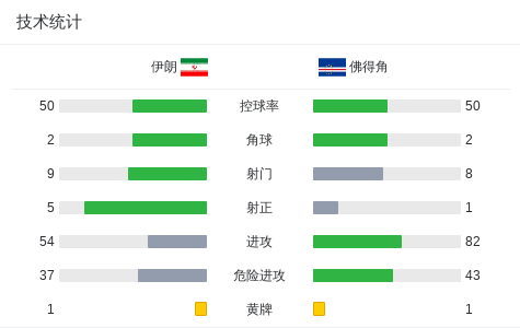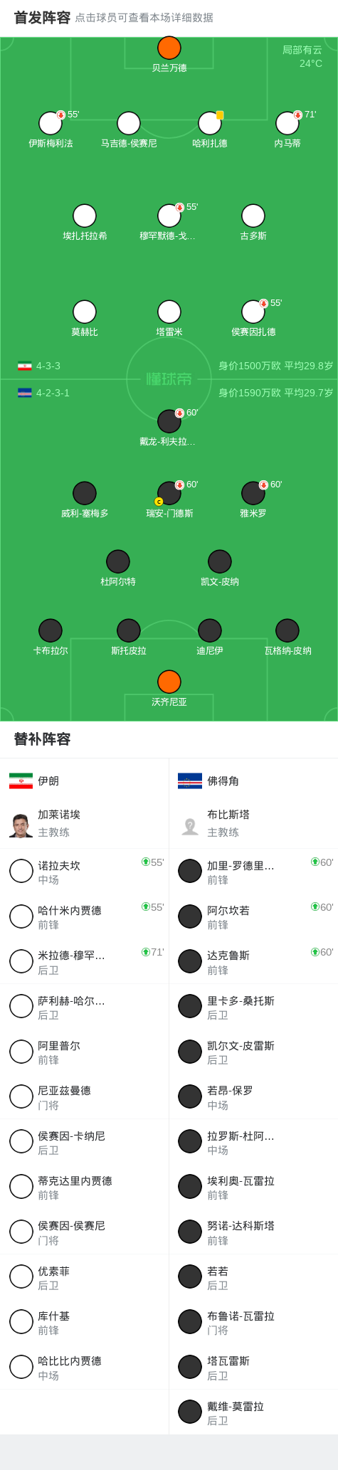 北京时间11月14日国际友谊赛,伊朗对阵佛得角 。最终比分伊朗 0–0 佛得角 。