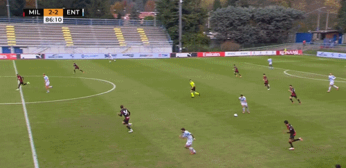 第87分钟,波尔塔诺瓦长途奔袭送助攻,德贝内代蒂推射反超比分,米兰2-3