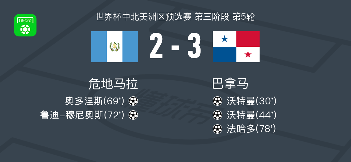 北京时间11月14日世界杯中北美洲区预选赛 第三阶段 第5轮,危地马拉对阵巴拿马。危地马拉奥多涅斯破门,鲁迪-穆尼奥斯破门。巴拿马沃特曼梅开二度,法哈多破门。最终比分危地马拉 2–3 巴拿马。