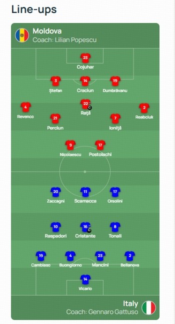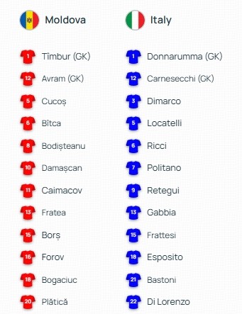 北京时间11月14日凌晨3点45分,世界杯欧洲预选第一阶段小组赛第9轮展开一场焦点战役,意大利对阵摩尔多瓦。赛前,双方公布首发阵容。