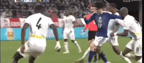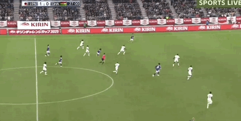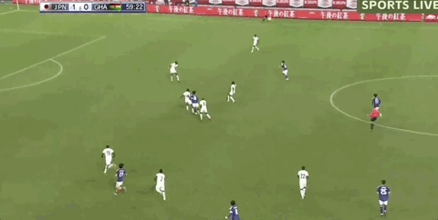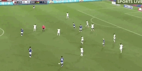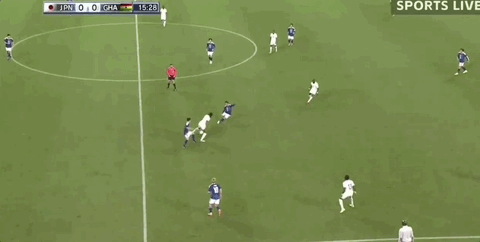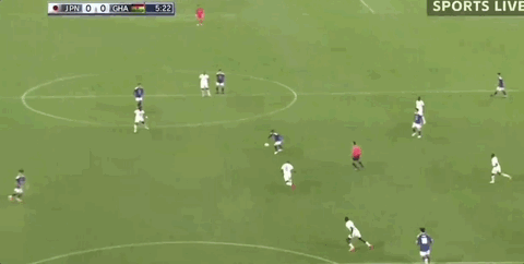 第27分钟,日本边路打穿加纳防线,横传中路堂安律中路推射被挡出