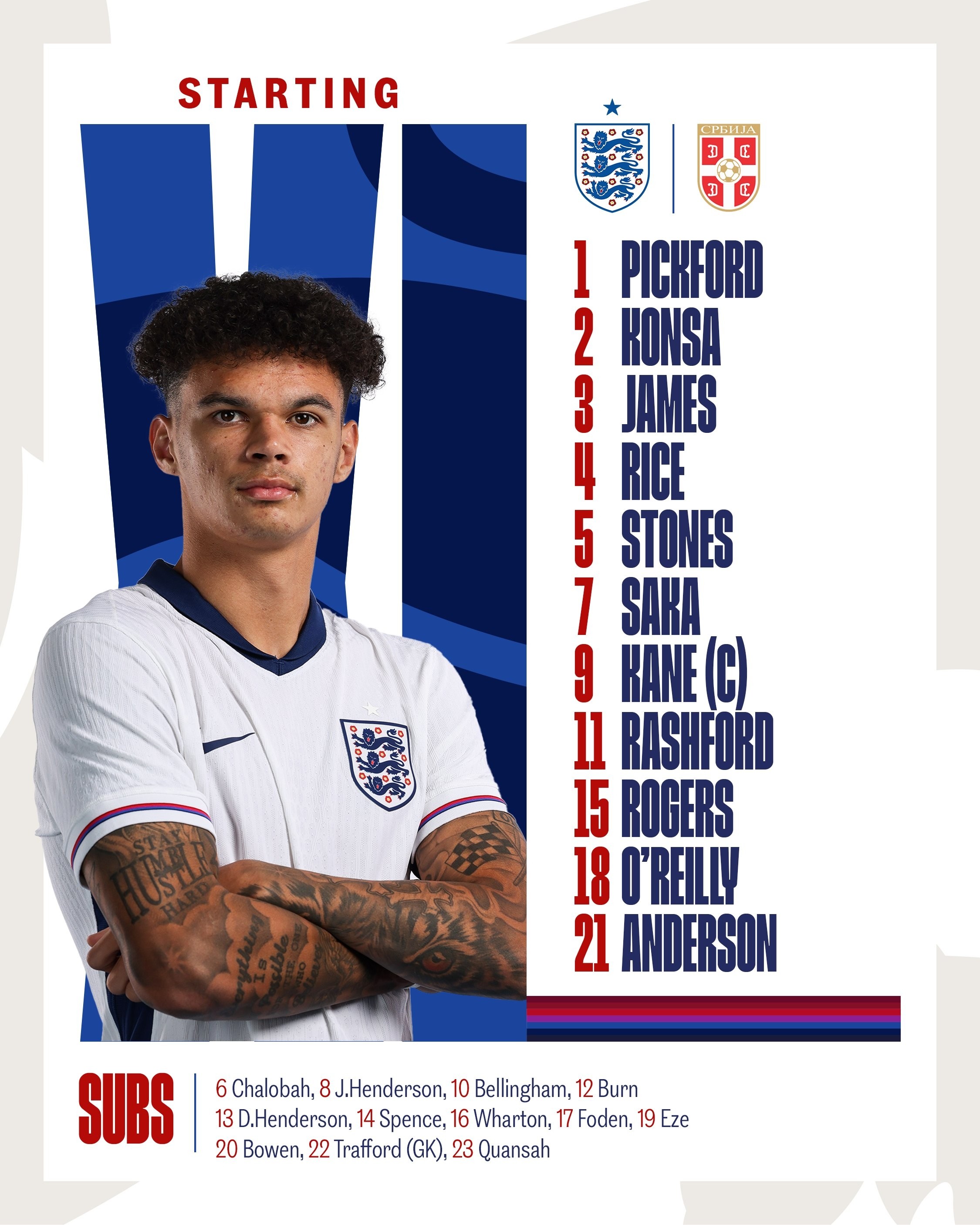 英格兰vs塞尔维亚:凯恩领衔,萨卡、赖斯出战,奥赖利首秀