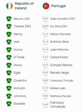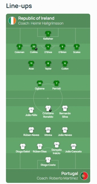 北京时间11月14日凌晨3点45分,世界杯欧洲预选第一阶段小组赛第9轮展开一场焦点战役,葡萄牙对阵爱尔兰。赛前,双方公布首发阵容。