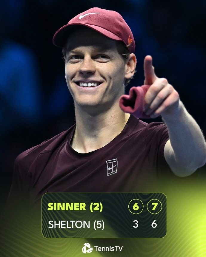 11月14日,ATP年终总决赛比约-博格组,卫冕冠军辛纳2-0(6-3、7-6(3))战胜5号种子谢尔顿,豪取室内硬地29连胜,小组赛不失一盘锁定小组第一,半决赛将战德米纳尔。