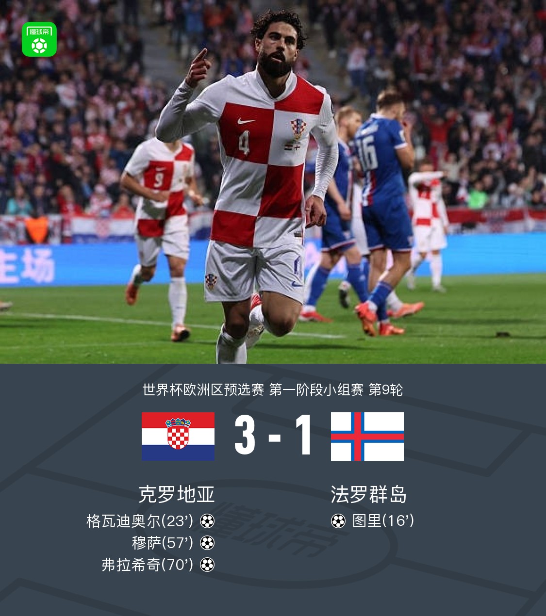 北京时间11月15日世界杯欧洲区预选赛 第一阶段小组赛 第9轮,克罗地亚对阵法罗群岛。克罗地亚格瓦迪奥尔破门,穆萨破门,弗拉希奇破门。法罗群岛图里破门。最终比分克罗地亚 3–1 法罗群岛。