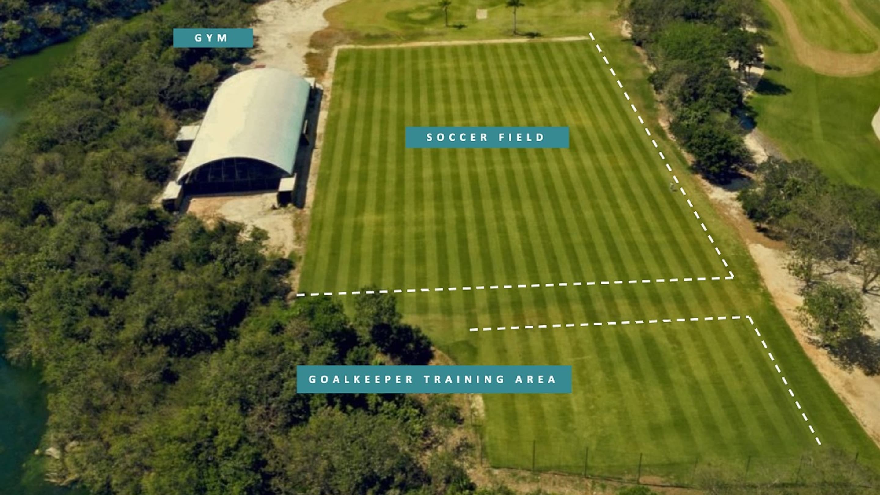 酒店提供的训练场地的一角被一片小树林占据。球场另一侧的边线也略微弯曲,绕过了周边的树木。此外,两个球门明显不配套,其中一个明显比另一个小。
