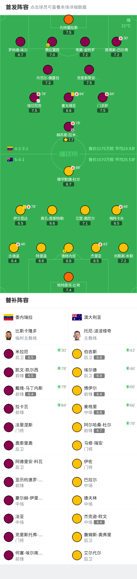 委内瑞拉1-0澳大利亚,赫苏斯-拉米雷斯一锤定音