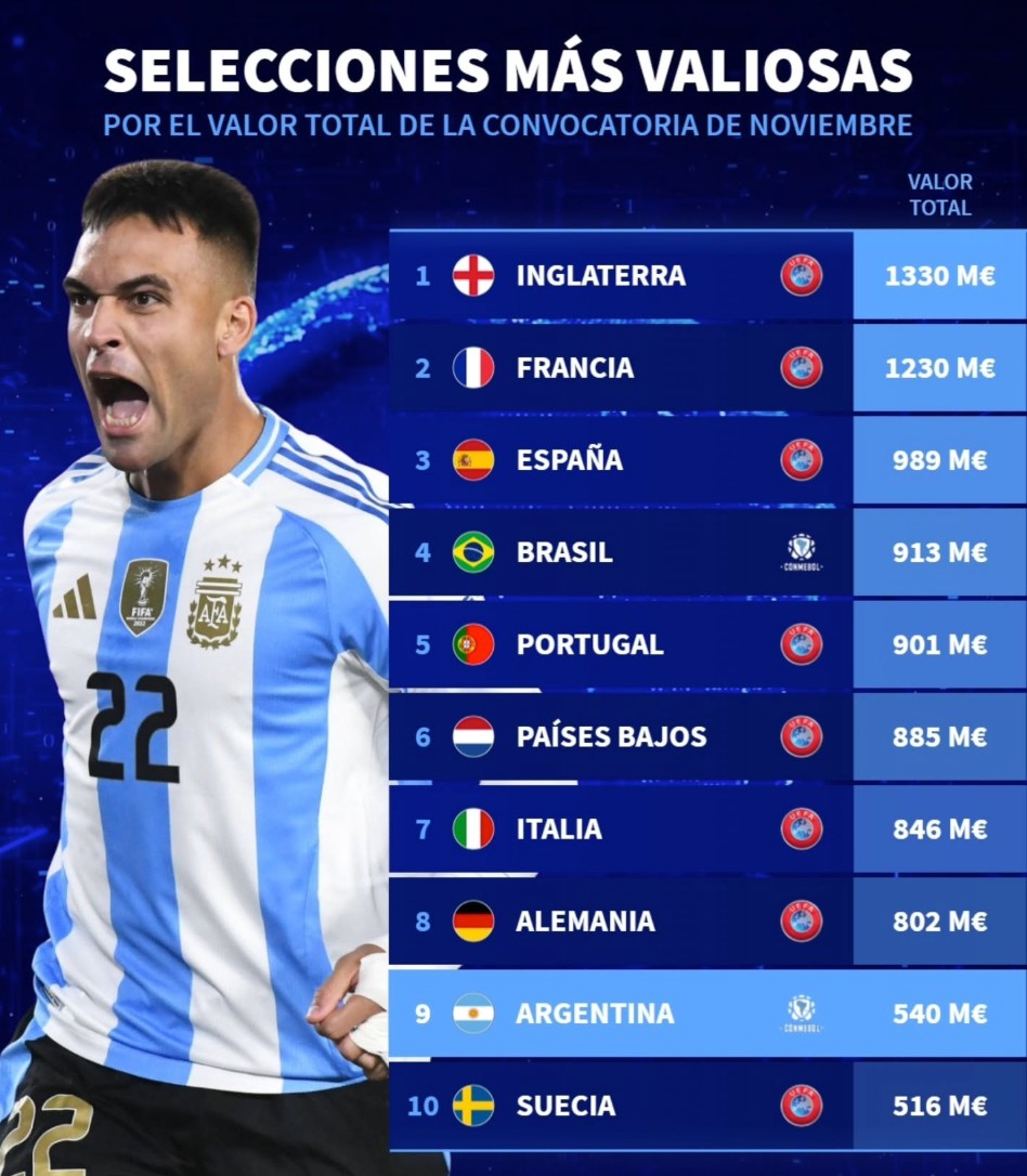 北京时间11月15日,德转统计出了本月国际比赛日国家队身价排名前10的球队,英格兰超13.3亿欧元第一,法国12.3亿欧元第二,西班牙9.89亿欧元第三,阿根廷5.4亿欧元第九。
