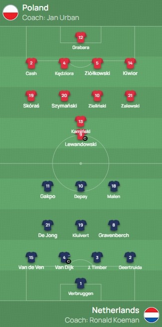 北京时间11月15日3:45,世预赛欧洲区小组赛G组第9轮,荷兰客战波兰,赛前双方首发出炉。