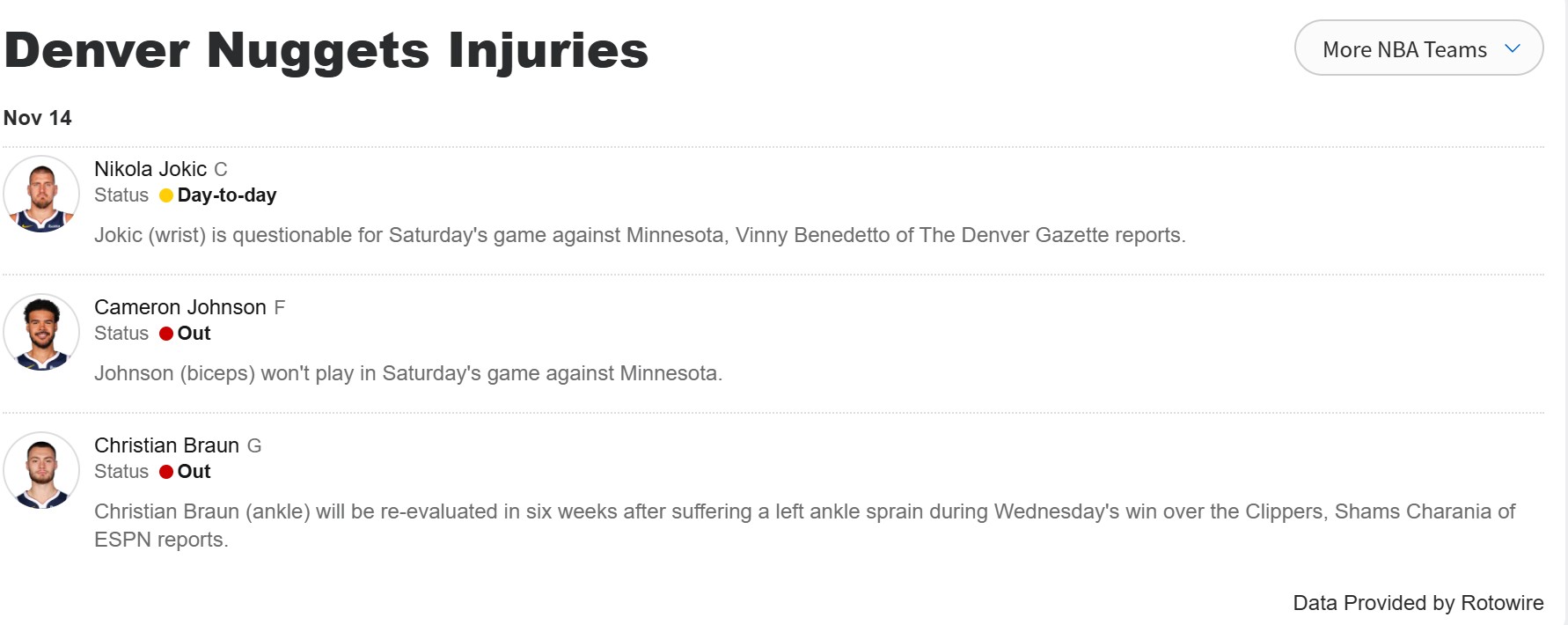 约基奇出战成疑的原因是右手腕伤势,这一伤势已经困扰约基奇有一段时间了。此外,球队前锋卡梅隆-约翰逊明日也将休战,他休战的原因是二头肌受伤。