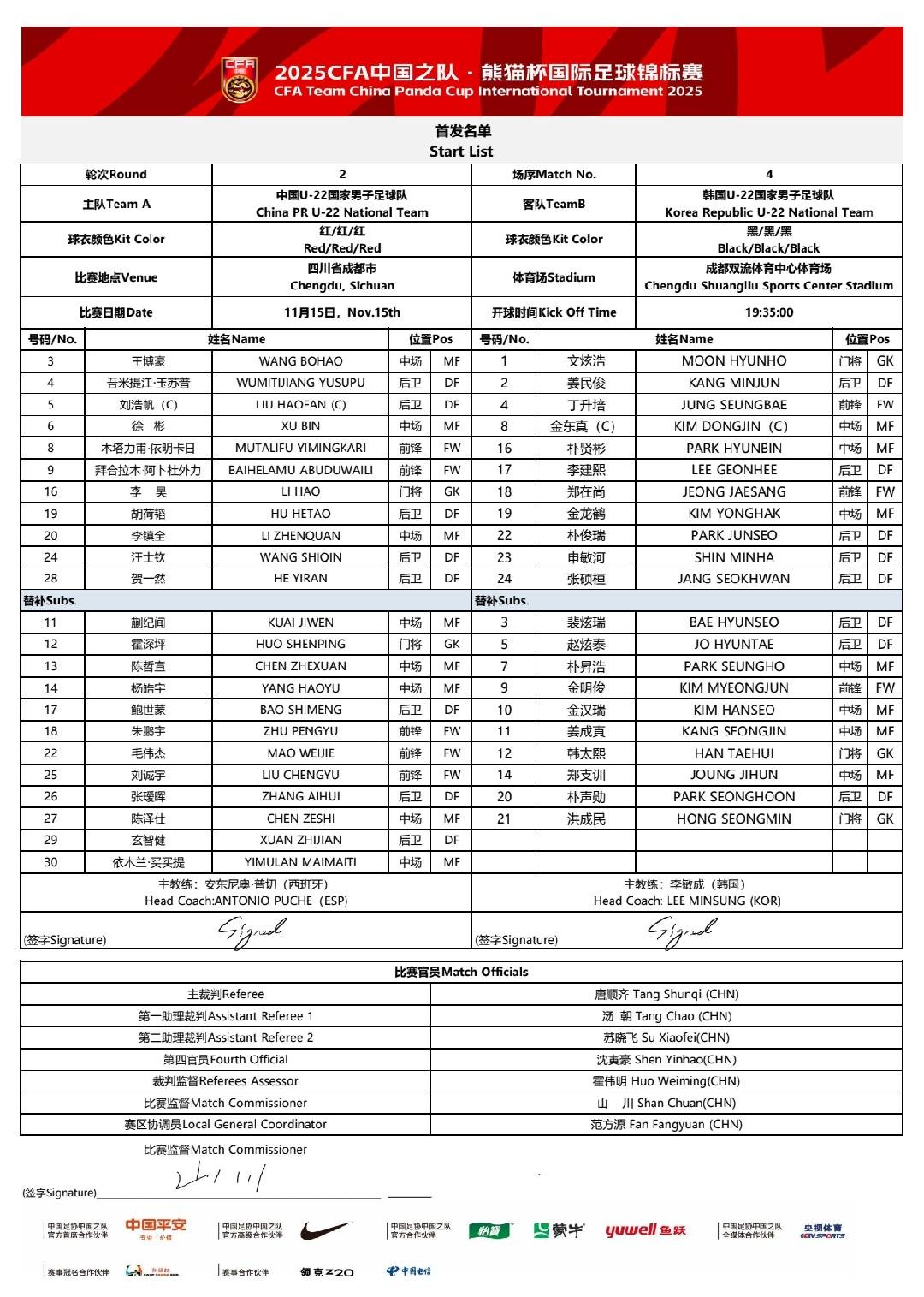 北京时间11月15日19:35,2025CFA中国之队·熊猫杯国际足球锦标赛第2轮在成都双流体育中心体育场继续进行,U22国足对阵韩国U22,赛前双方首发出炉。
