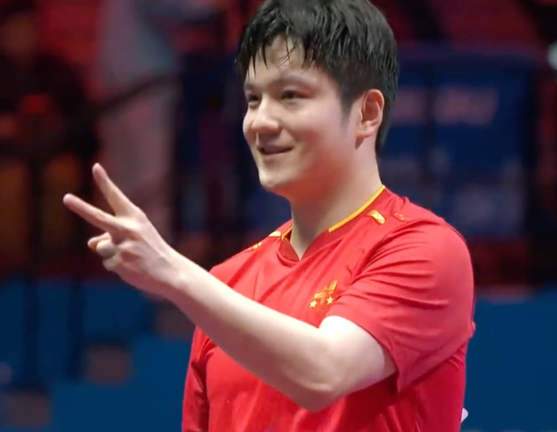 这一次,在击败林诗栋后,樊振东的庆祝动作则是继续模仿姆巴佩,这个动作也是取材自NBA球星库里。樊振东在今天的比赛里,1-1过后连胜三局,完成了第二次加冕男单冠军,这或许是他做出这个动作的原因。