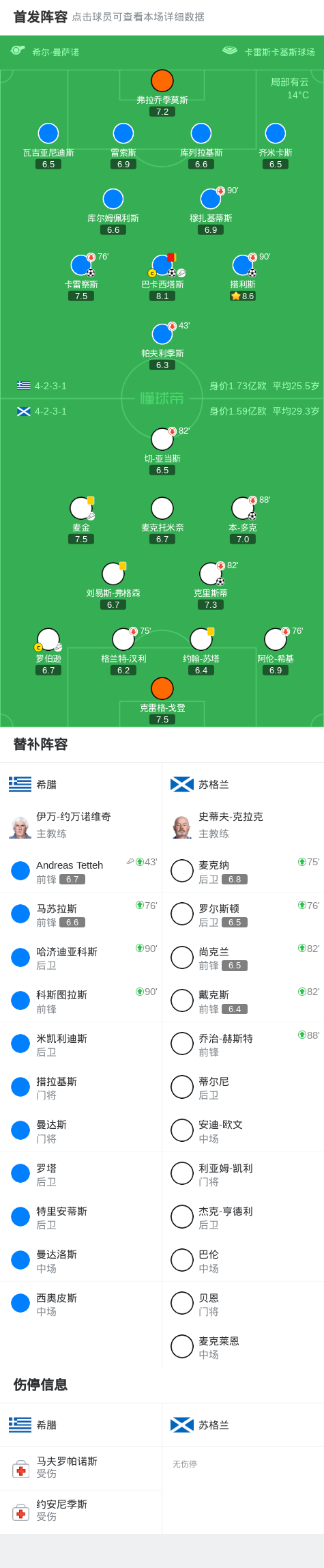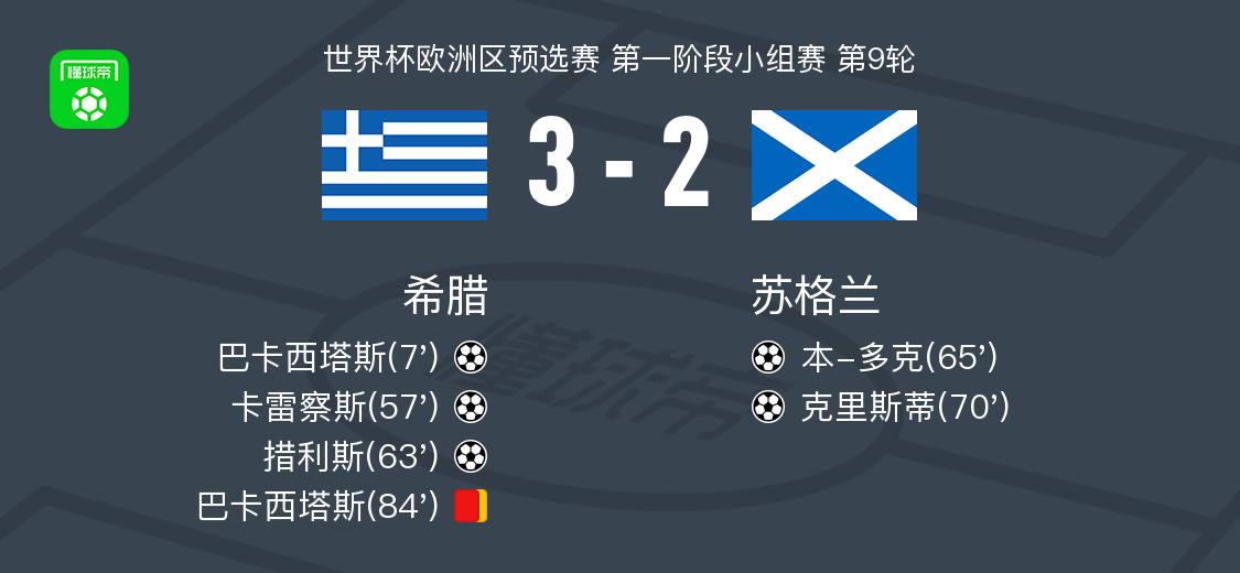 北京时间11月16日,世界杯欧洲区预选赛第一阶段小组赛第9轮,希腊与苏格兰展开对决。比赛伊始,巴卡西塔斯为希腊率先破门,帮助球队取得领先。随后,卡雷察斯接应队友传球再下一城,扩大比分优势。不久后,巴卡西塔斯送出助攻,措利斯冷静施射得手,进一步巩固领先局面。