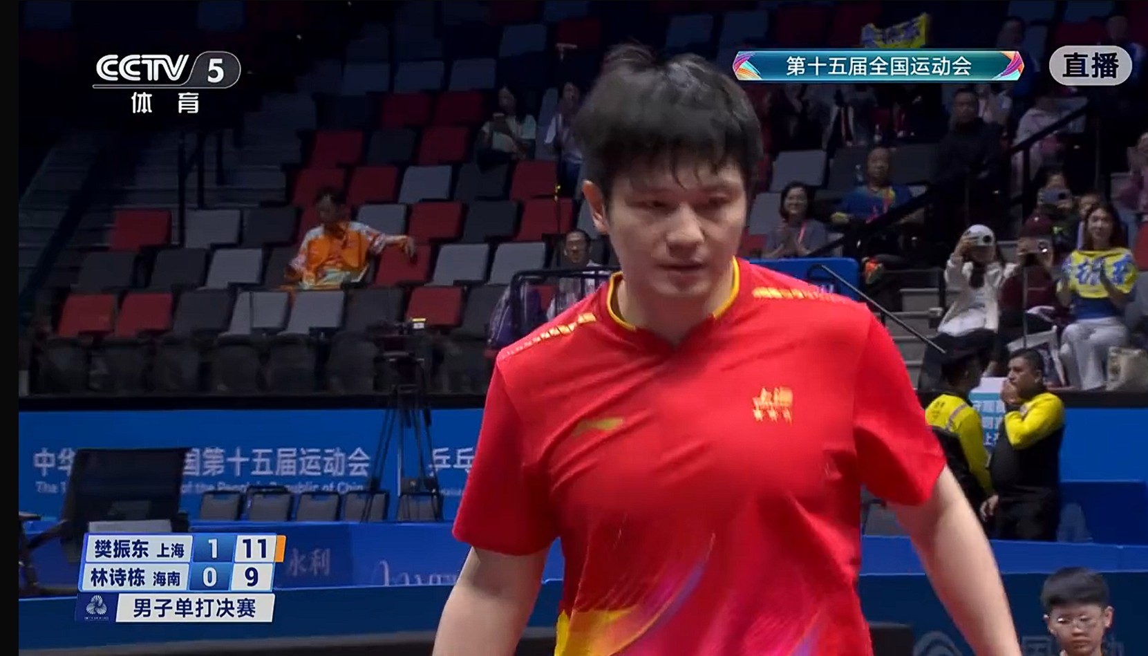 11月16日,全运会乒乓球成年组男单金牌赛,樊振东4-1(11-9、8-11、11-5、11-3、11-4)战胜林诗栋,卫冕成功。樊振东继马龙后,成为全运乒乓第二位卫冕男单冠军的人,也收获了自己的全运会第6金。