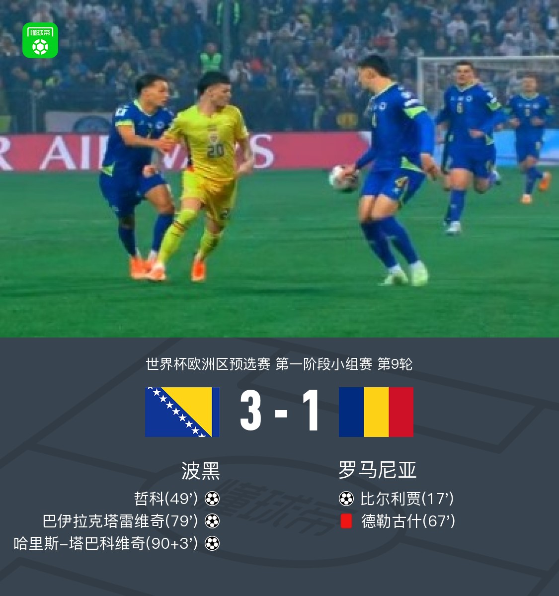 第49分钟,哲科头球被挡,随后补射破门扳平比分,波黑1-1罗马尼亚