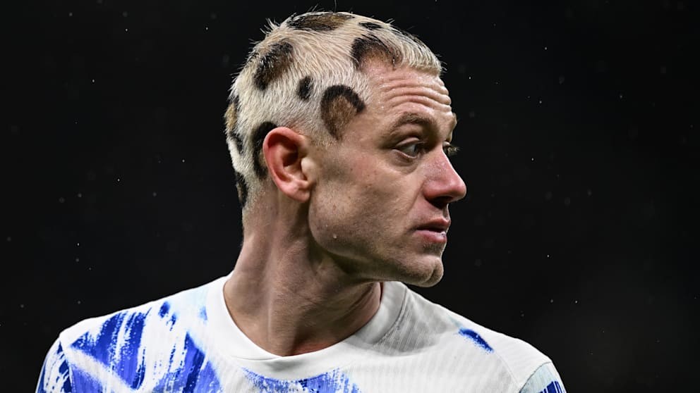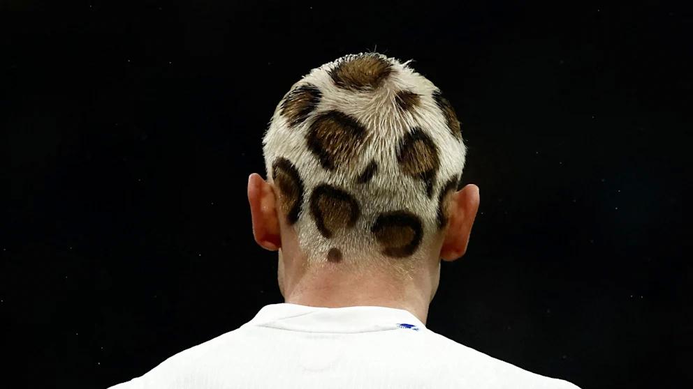挪威国脚瑞尔森以其独特的造型吸引了众人的目光,他那漂白的头发上点缀着黑色轮廓的棕色斑块非常引人注目,这个豹纹造型引起了轰动。