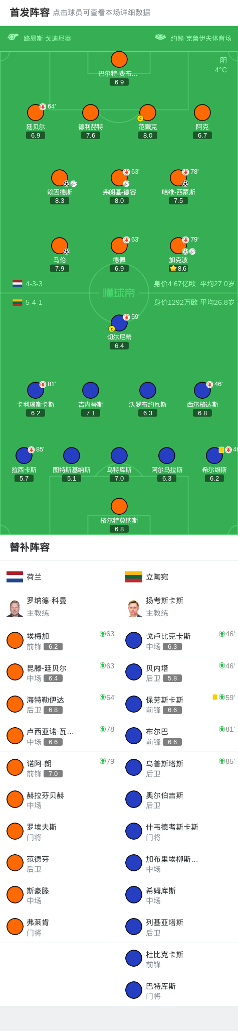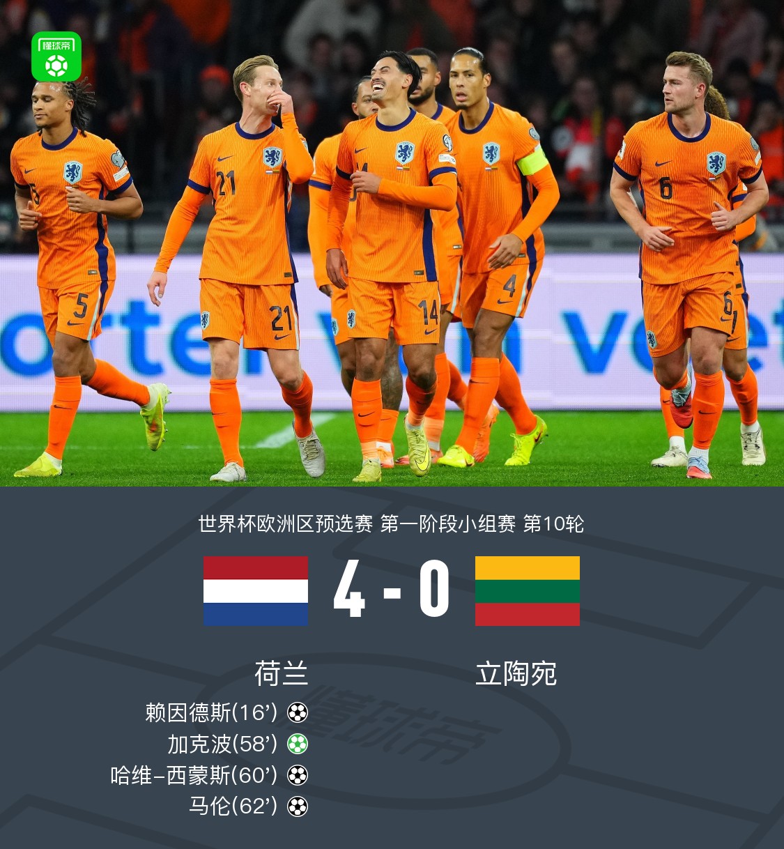 北京时间11月18日世界杯欧洲区预选赛 第一阶段小组赛 第10轮,荷兰对阵立陶宛。荷兰赖因德斯破门,哈维-西蒙斯破门,马伦破门,加克波破门。最终比分荷兰 4–0 立陶宛。