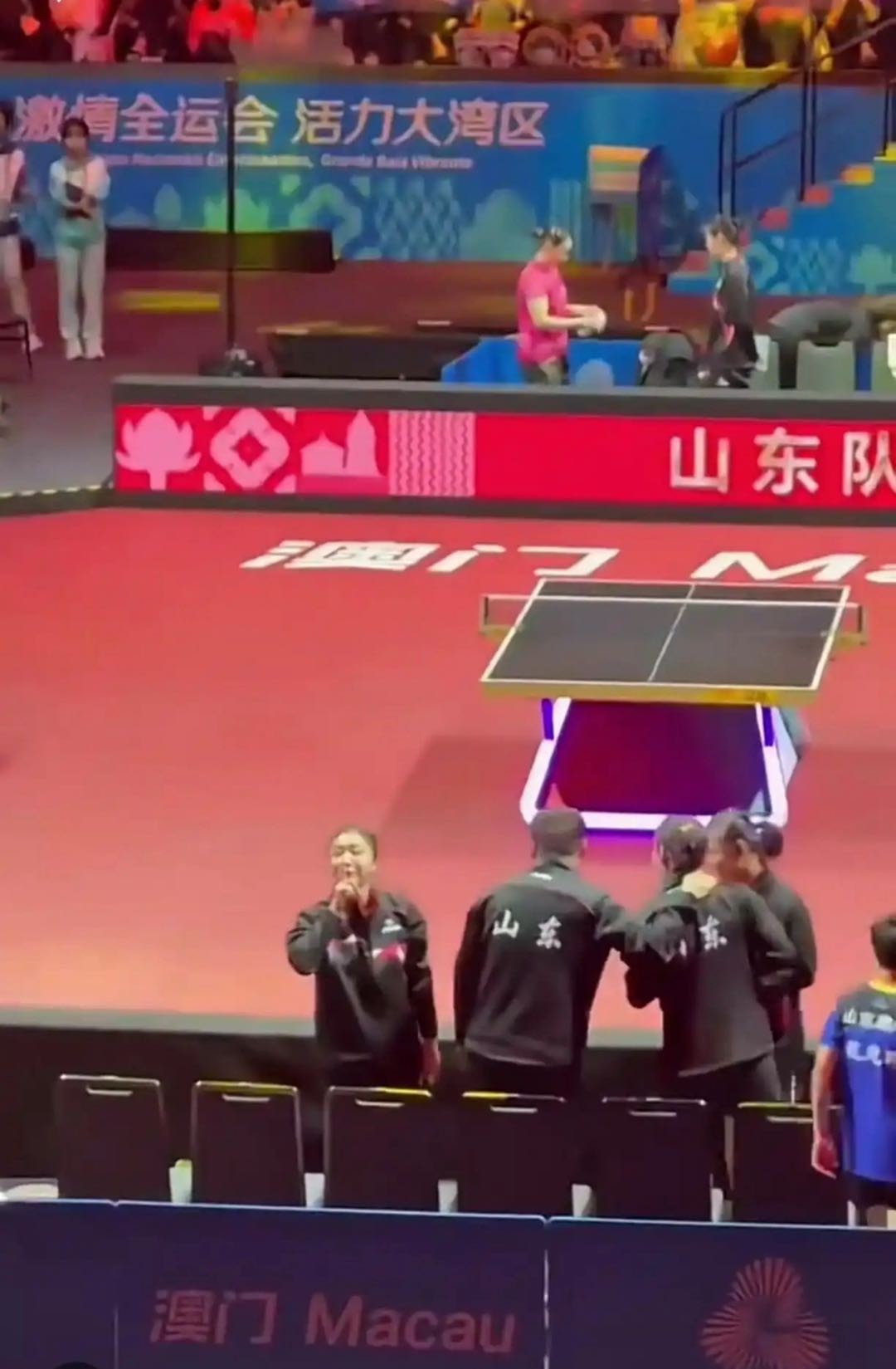11月19日,全运会乒乓球女团金牌赛,山东女团3-2战胜河北女团,夺得金牌。赛后,陈梦对观众席做出手势。