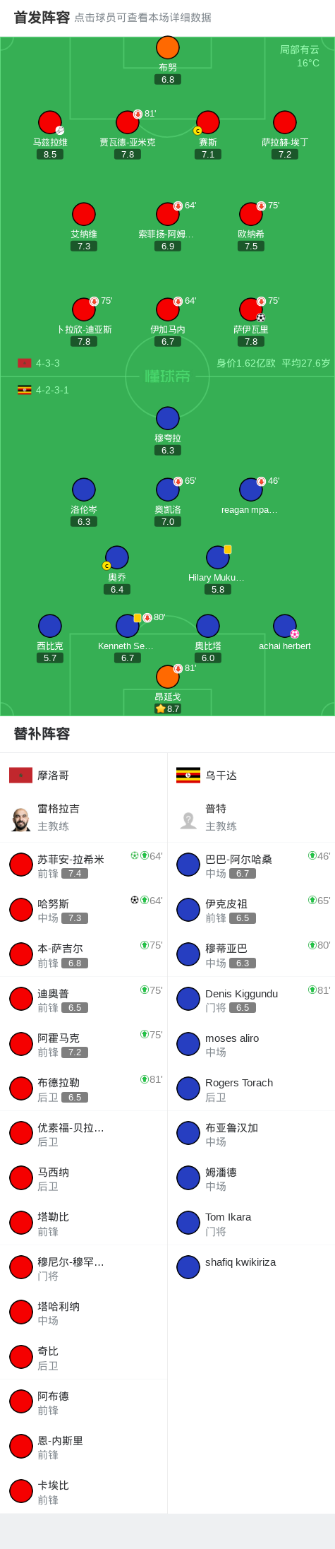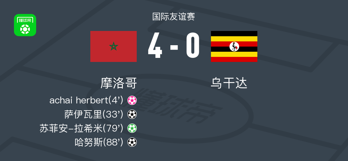 国际友谊赛,摩洛哥对阵乌干达。比赛伊始,乌干达球员achai herbert不慎自摆乌龙,为摩洛哥取得领先。随后,马兹拉维送出助攻,萨伊瓦里接球后冷静破门,进一步扩大比分。下半场,苏菲安-拉希米主罚点球命中,帮助球队再下一城。临近尾声阶段,哈努斯抓住机会攻入一球,锁定胜局。最终全场比赛结束,摩洛哥以4比0战胜乌干达。