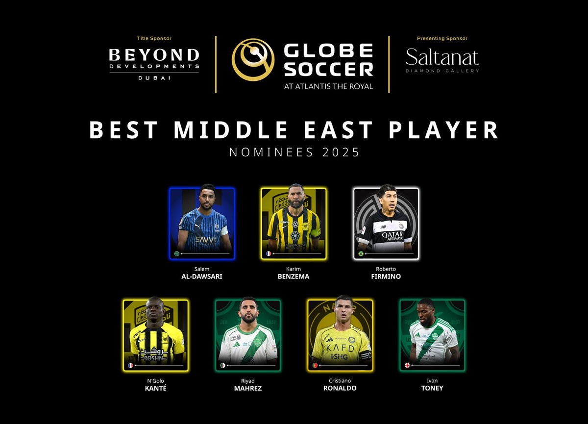 北京时间11月19日,环球足球奖官方公布了2025年度中东最佳球员候选名单,其中C罗、本泽马领衔,坎特、菲尔米诺、马赫雷斯、伊万-托尼、达瓦萨里在列。