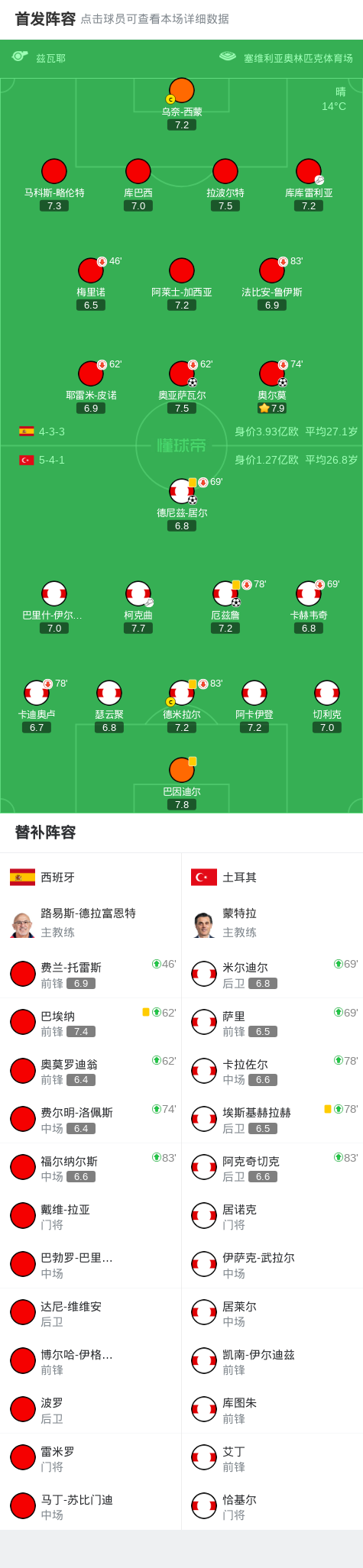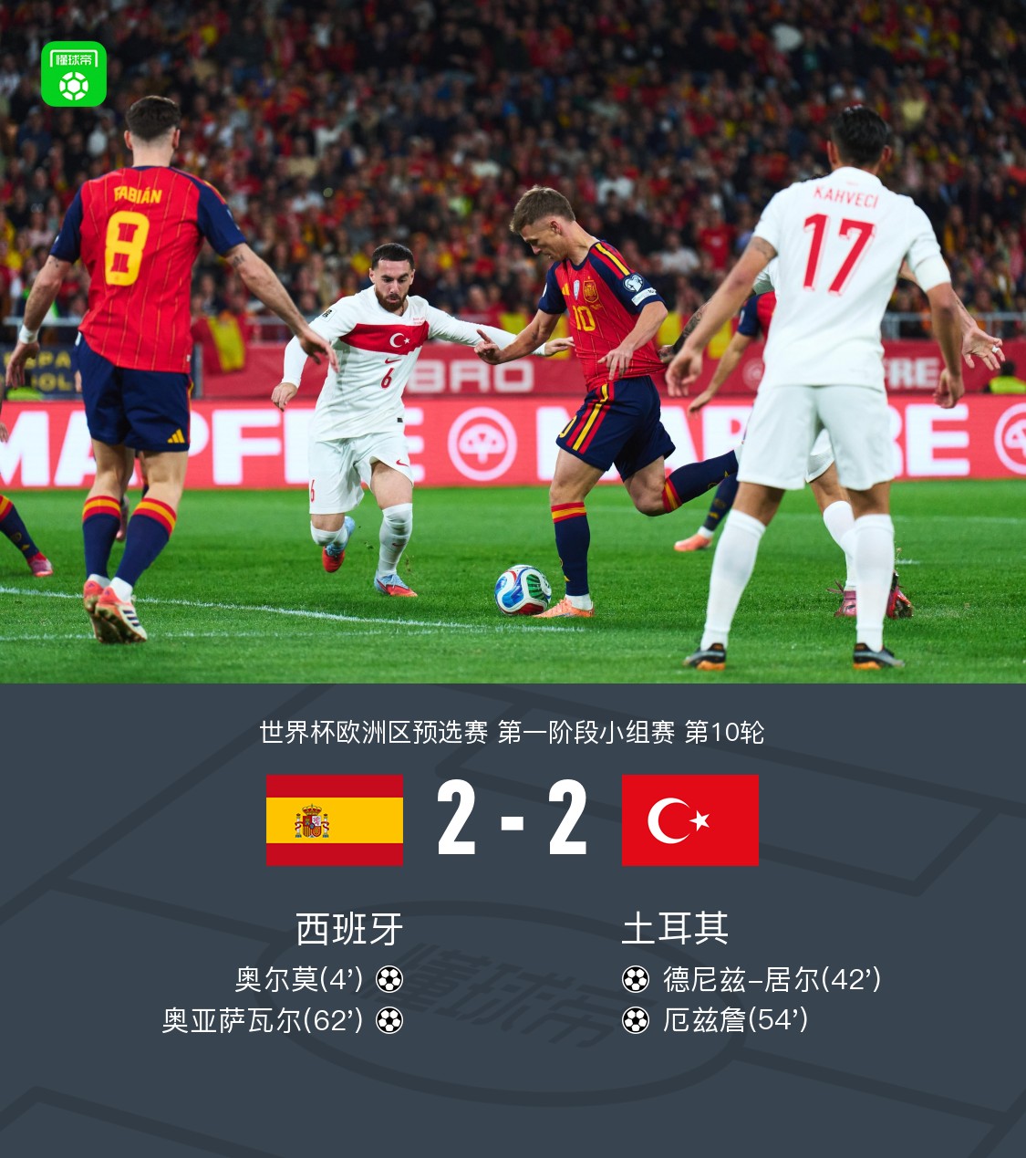 在世界杯欧洲区预选赛第一阶段小组赛第10轮的一场较量中,西班牙与土耳其展开激烈对决。比赛伊始,库库雷利亚送出助攻,奥尔莫率先破门,为西班牙取得领先。随后,德尼兹-居尔抓住机会扳平比分。下半场,柯克曲助攻厄兹詹攻入反超一球,土耳其实现逆转。然而西班牙迅速作出回应,奥亚萨瓦尔完成进球,将比分再度拉回平衡。最终双方战成2比2平局。