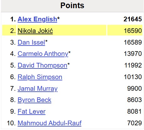 排在掘金队史第一位的是球队名宿阿莱克斯-英格利什,他以21645分排名第一。