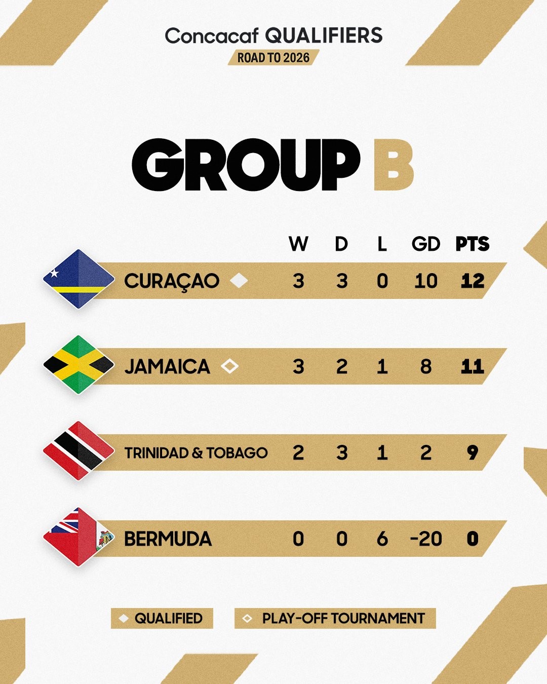 库拉索在中北美第二阶段小组赛四战全胜轻松晋级第三阶段,在分组时位列二档,并抽中了一档里世界排名最低的牙买加,同组还有特立尼达和多巴哥以及百慕大群岛,算是抽中了好签。库拉索两回合对阵特立尼达和多巴哥都没有赢下,但最关键的是,他们在第3轮2-0拿下了与牙买加的直接对话!