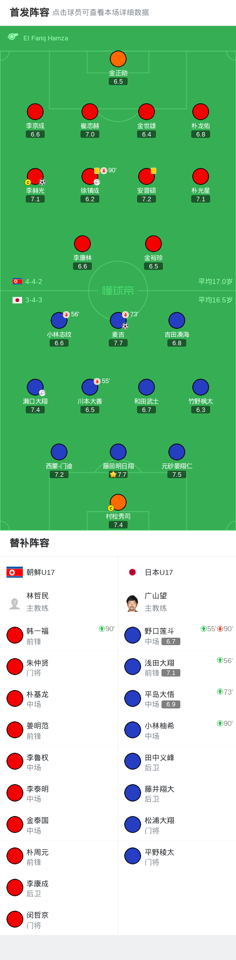 北京时间11月18日U17世界杯 1/8决赛,朝鲜U17对阵日本U17。朝鲜U17李赫光破门。日本U17麦吉破门。最终比分朝鲜U17 56 日本U17。