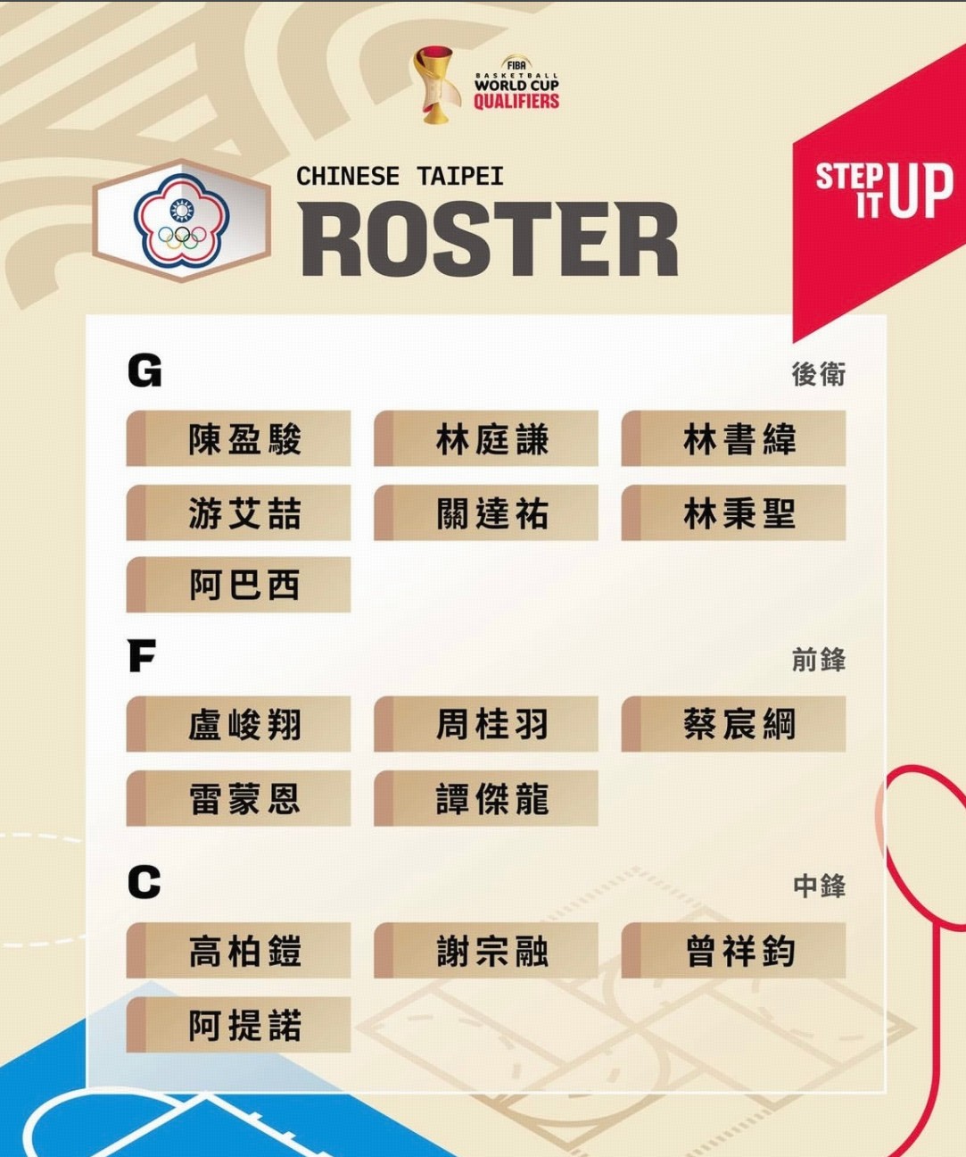 除了效力CBA的陈盈骏、林庭谦和林秉圣之外,前NBA球员林书豪的弟弟林书纬也在其中。两位归化球员高柏铠、阿提诺也在列。