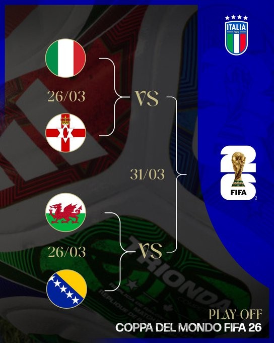 在今天晚上进行的2026年世界杯欧洲区附加赛抽签仪式上,意大利被抽到将与北爱尔兰交手。