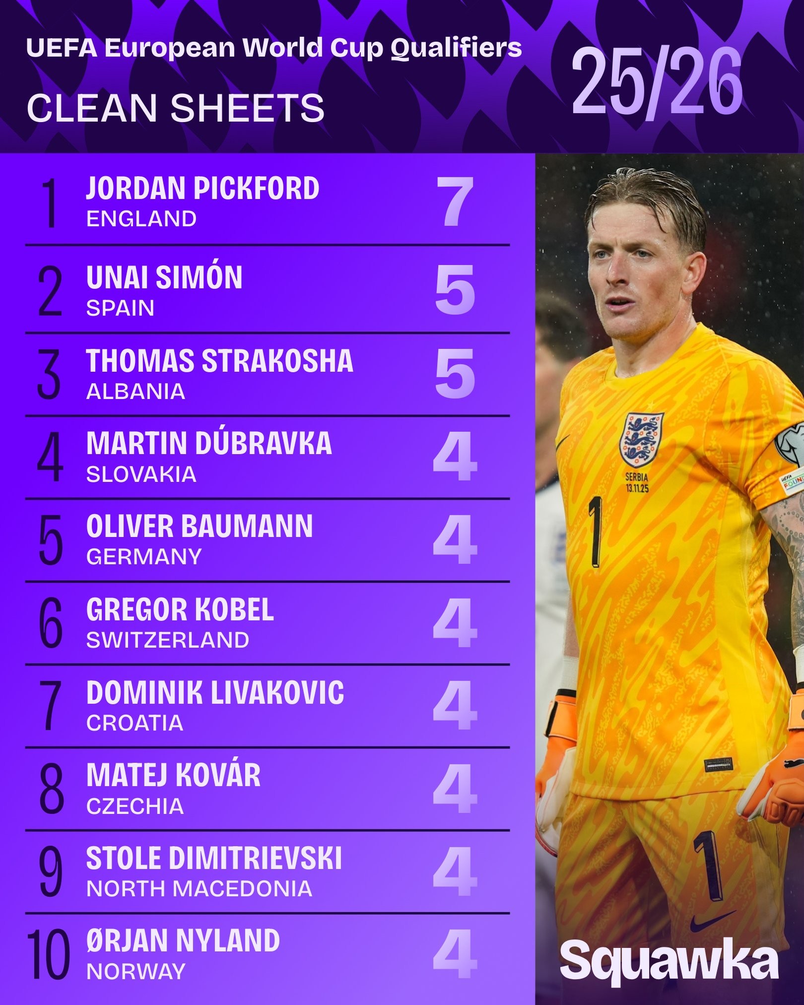 当地时间11月19日,知名数据机构Squawka统计了2026年世界杯欧洲区预选赛第一阶段的门将零封场次。