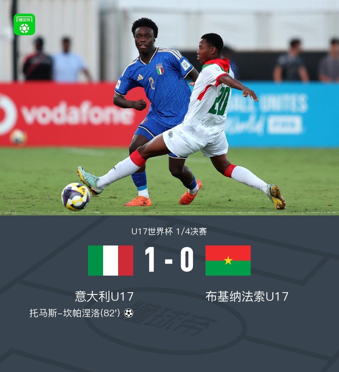 在U17世界杯1/4决赛中,意大利U17与布基纳法索U17展开激烈较量。上半场,宗戈兜射击中横梁;下半场拉希姆-瓦塔拉出球失误,托马斯-坎帕涅洛笑纳大礼攻入全场唯一进球。最终,意大利U17 1-0战胜布基纳法索U17,晋级四强。