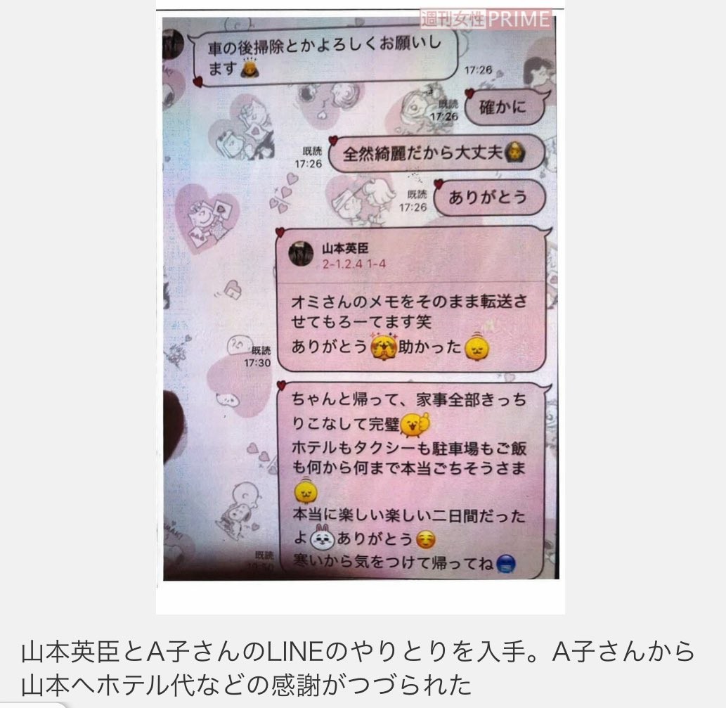 据报道,山本英臣是一名已婚人士,与妻子育有三个孩子。但从去年冬天开始,他被指控与一名已婚女子A女士存在婚外情关系。A女士同样是两个孩子的母亲。两人经常通过‘Line’保持密切联系,在无法见面时甚至会互相发送诸如‘想你了’之类的信息。当A女士发送‘正在洗澡’的消息时,山本英臣还回复过‘真想偷看你在洗澡的样子呢’这样颇为露骨的内容。