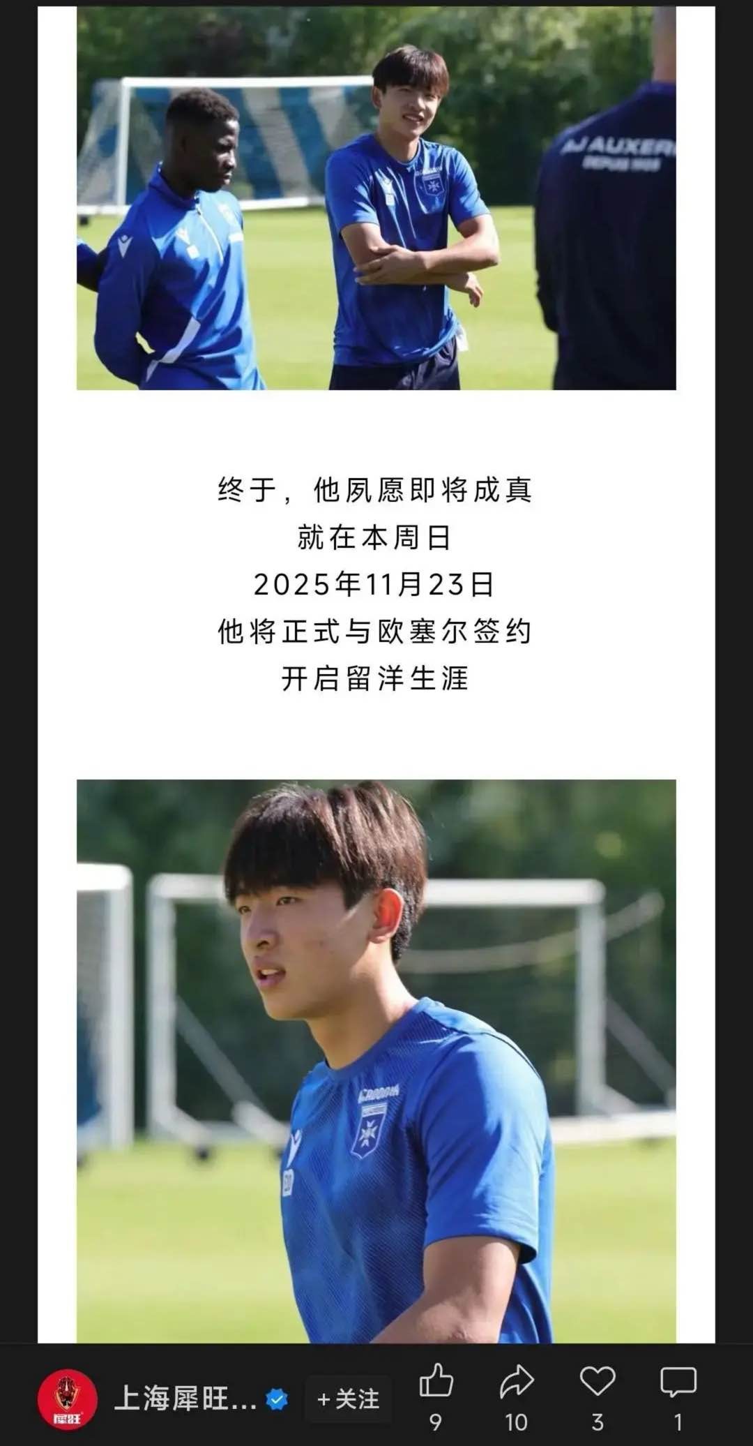 欧塞尔赞助商犀旺发文称魏祥鑫将签约欧塞尔,现已删除
