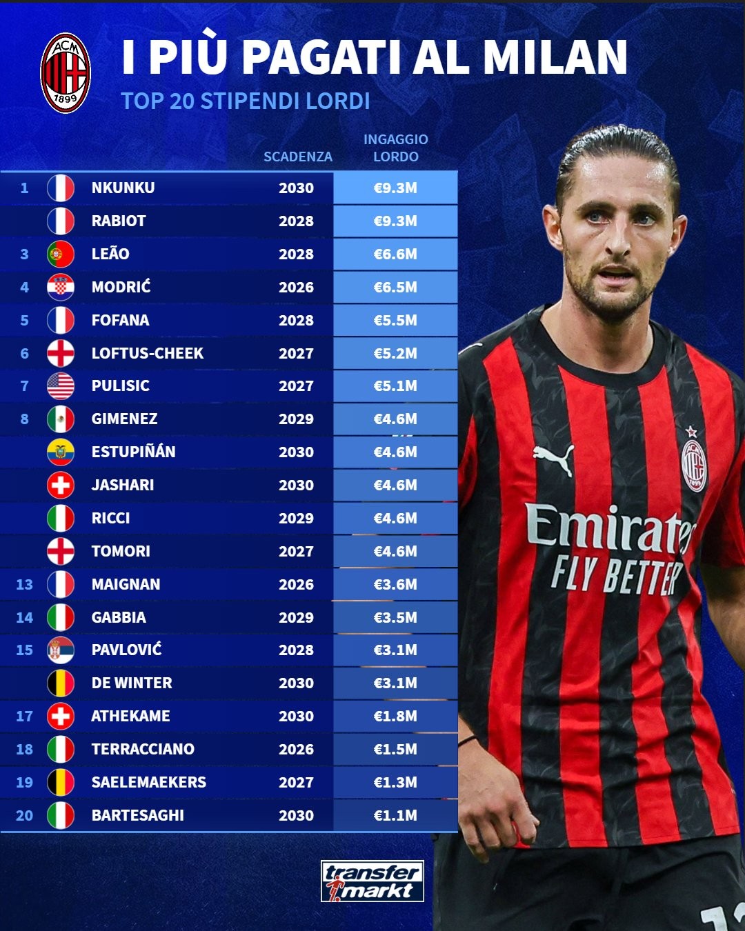北京时间11月21日,德转统计出了AC米兰本赛季税前年薪排名前20的球员,恩昆库和拉比奥这两位新援同以930万欧元并列第1,莱奥660万欧元第3,莫德里奇650万欧元第4,普利希奇510万欧元队内排名第7,萨勒马克尔斯仅130万欧元队内排名第19位。