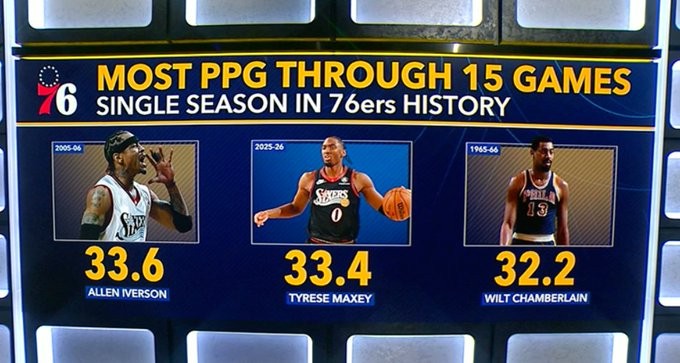 据统计,马克西在本赛季前15场比赛中场均得到了33.4分,这在队史上能够排在第二位,超越了第三位威尔特-张伯伦的32.2分,仅次于阿伦-艾弗森的33.6分。