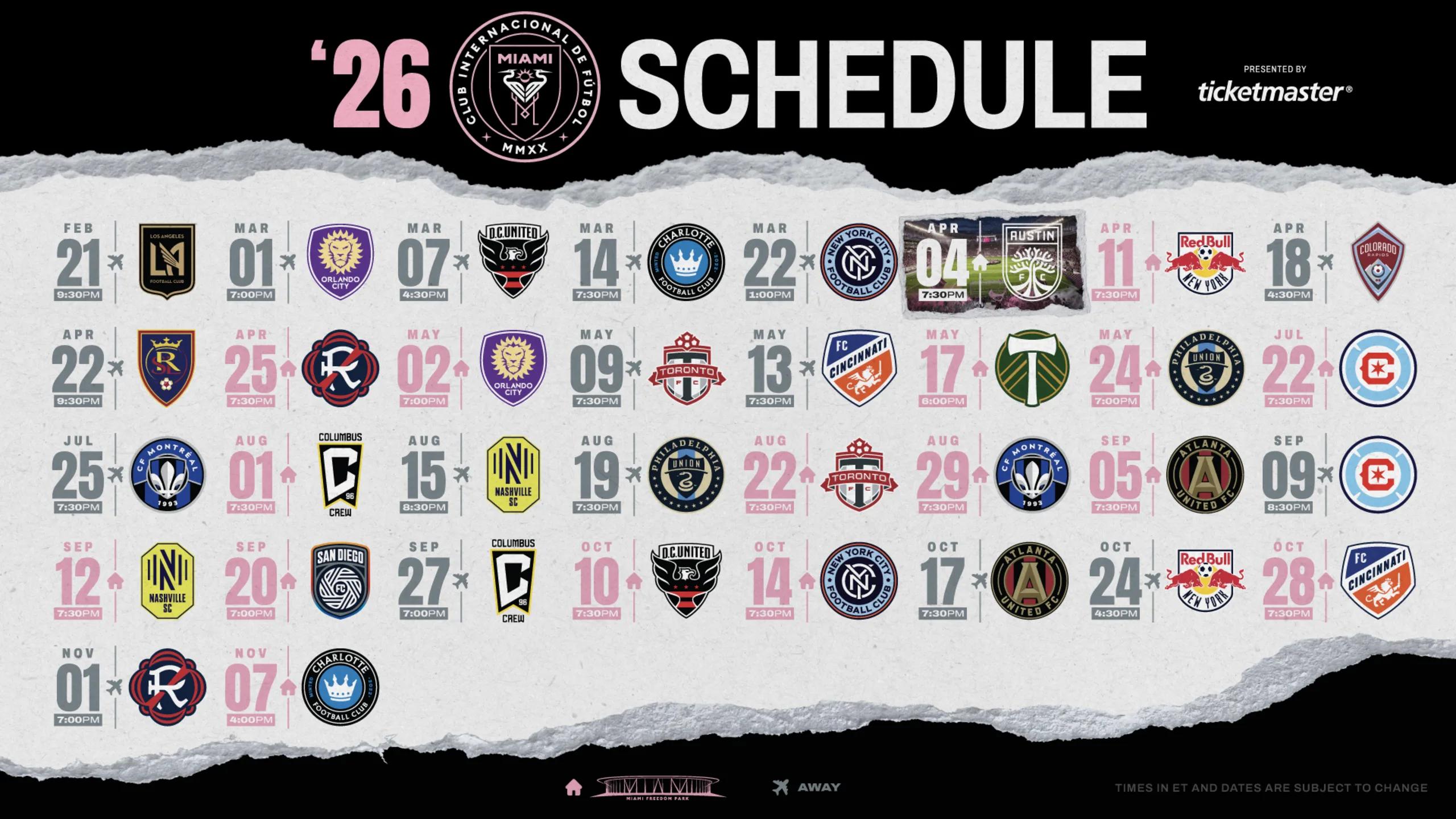 北京时间11月21日,迈阿密国际官方公布了他们2026赛季美职联常规赛的赛程安排,他们的首场比赛将是当地时间明年2月21日做客挑战拥有孙兴慜的洛杉矶,而他们新赛季的首个主场比赛则是4月4日主场对阵奥斯汀。
