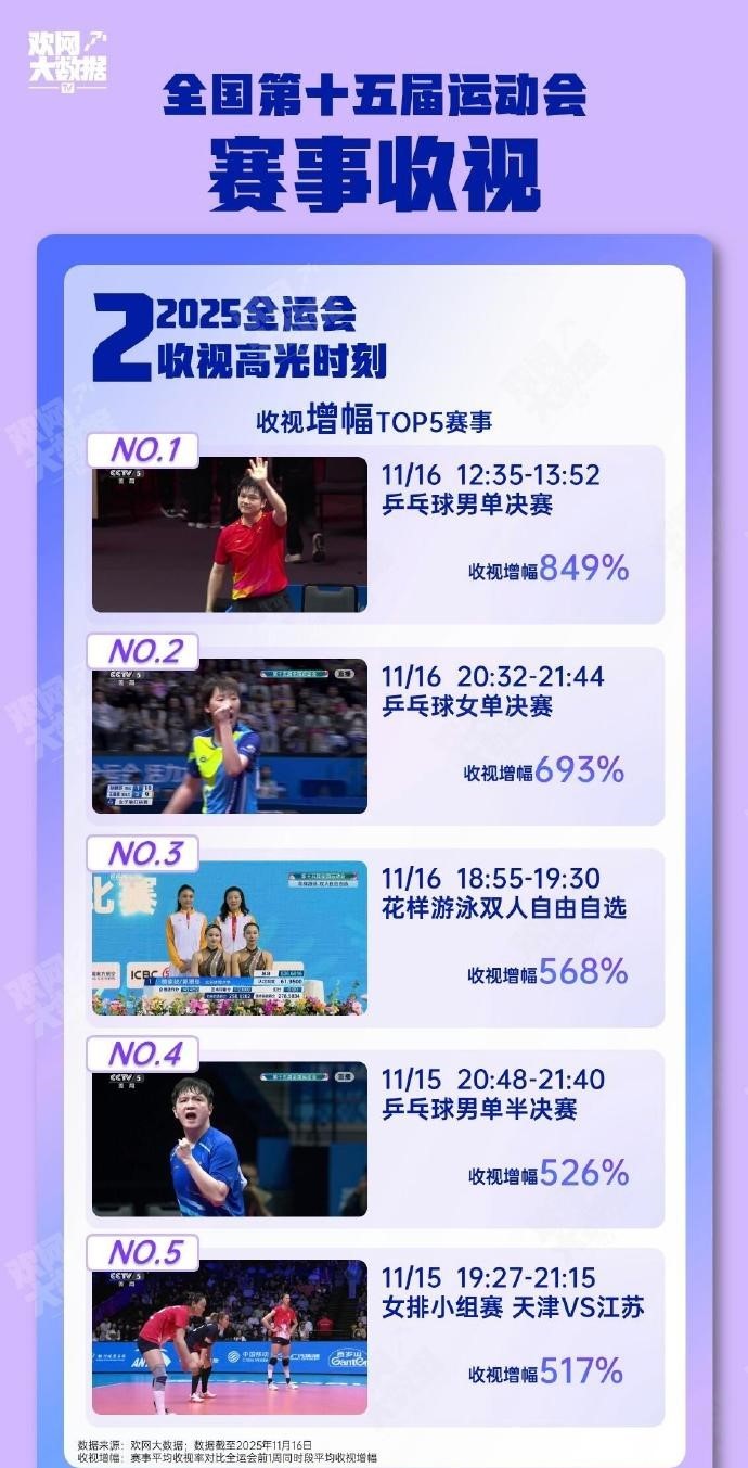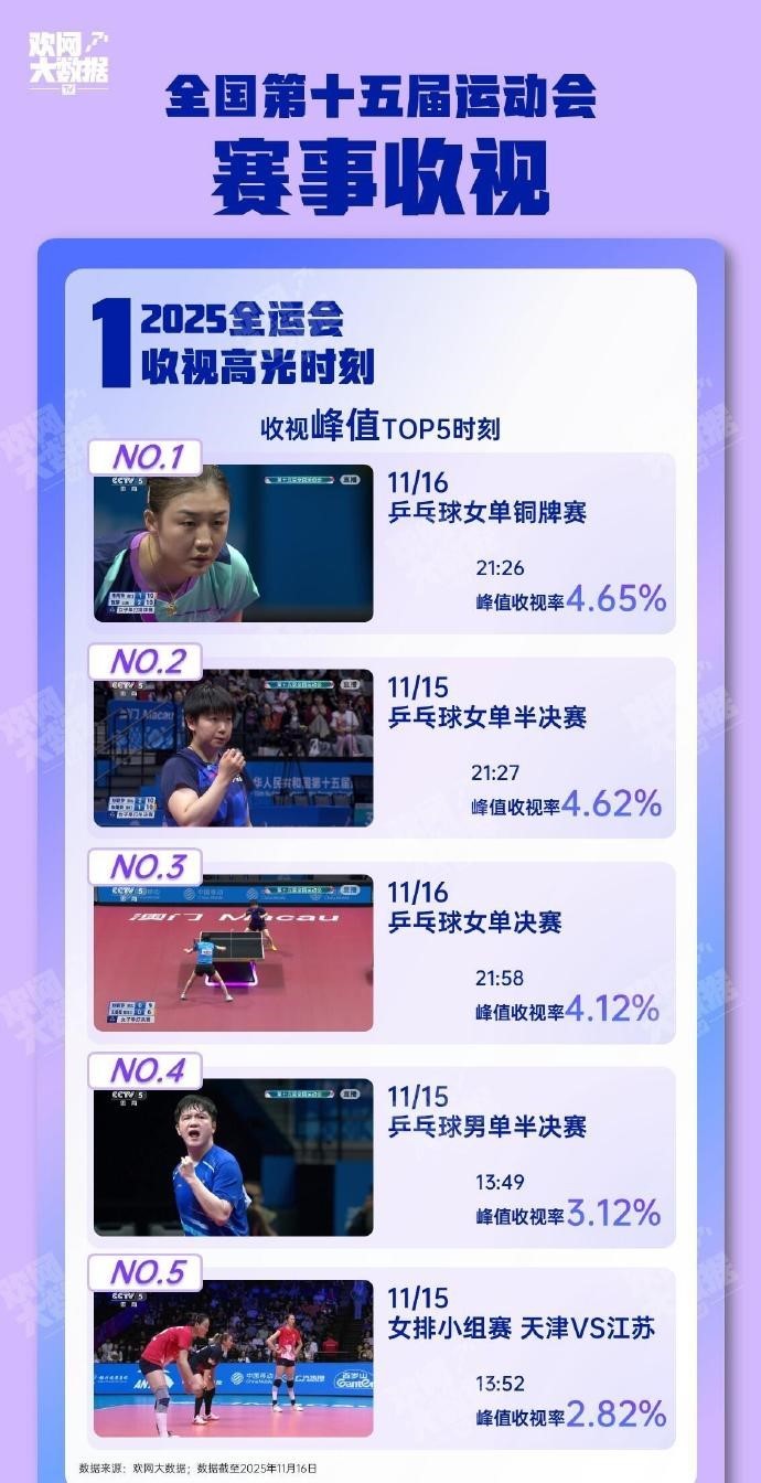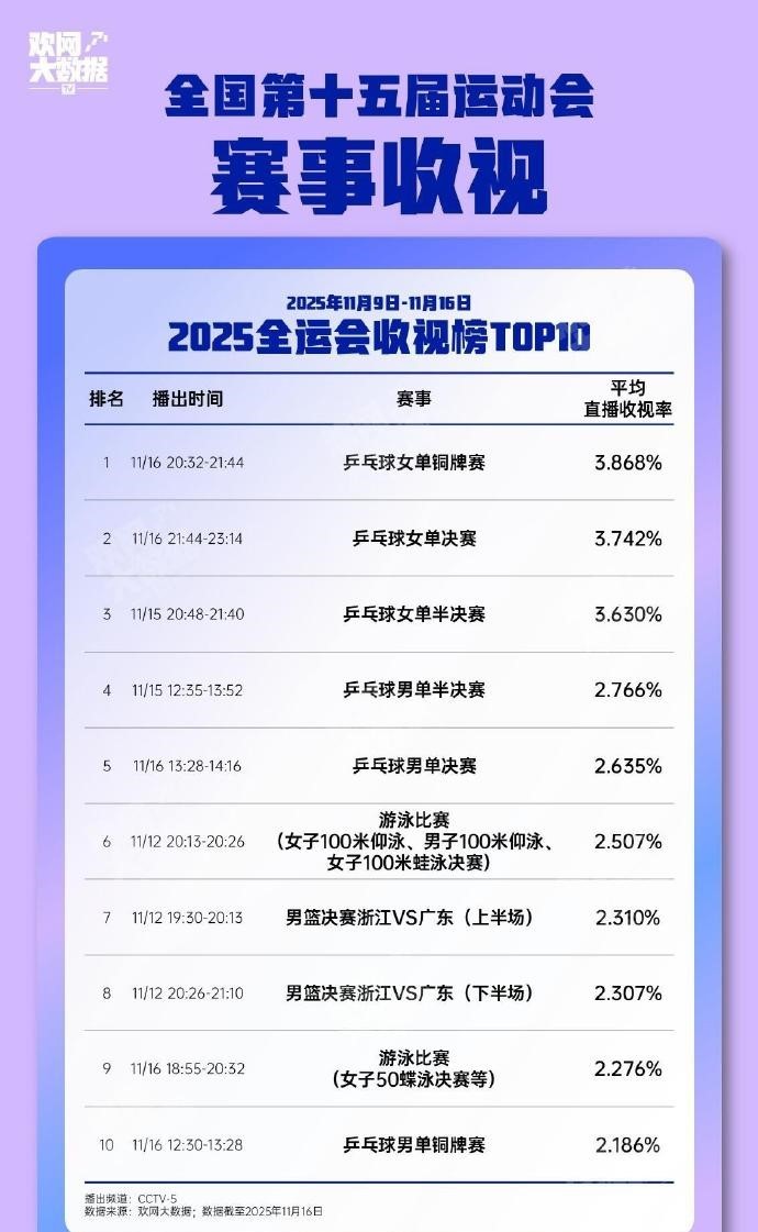 11月21日,全运会比赛全部收官,本届赛事收视率前十出炉:乒乓球女单铜牌赛位列榜首,乒乓球项目占据前五。