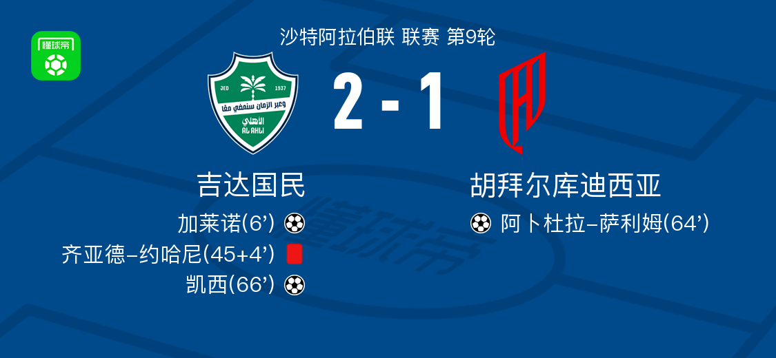 北京时间11月22日沙特阿拉伯联 联赛 第9轮,吉达国民主场对阵胡拜尔库迪西亚。吉达国民加莱诺破门,凯西破门。胡拜尔库迪西亚阿卜杜拉-萨利姆破门。最终比分吉达国民 21 胡拜尔库迪西亚。