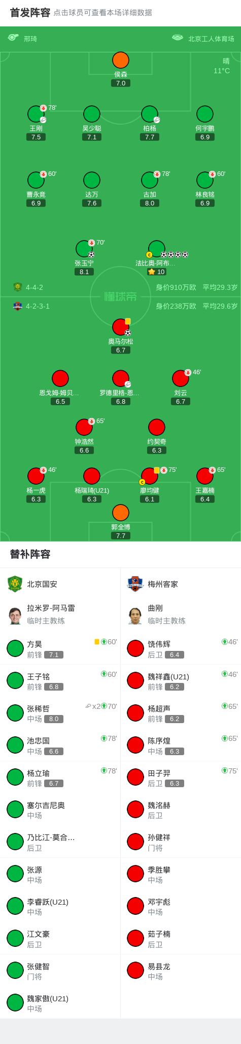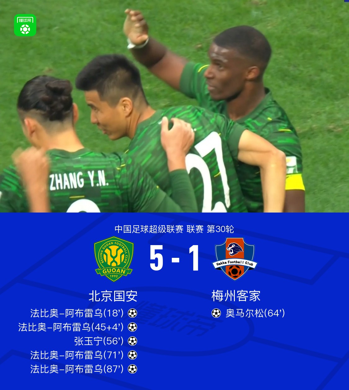 北京时间11月22日中国足球超级联赛 联赛 第30轮,北京国安主场对阵梅州客家。北京国安法比奥-阿布雷乌大四喜,张玉宁破门。梅州客家奥马尔松破门。最终比分北京国安 5–1 梅州客家。