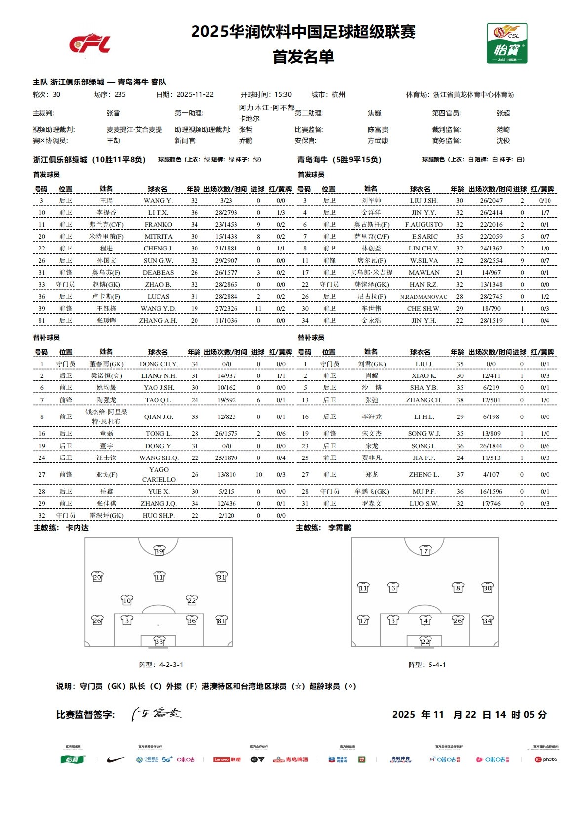 北京时间11月22日15:30,中超第30轮,浙江队主场对阵青岛海牛,本场比赛主裁判是张雷,VAR是麦麦提江,赛前双方公布首发: 文章导航 山东客战三镇:双方均四外援首发,李源一、谢文能出战 欧洲前10联赛场均进球:荷甲3.36球第1,意甲2.22球垫底