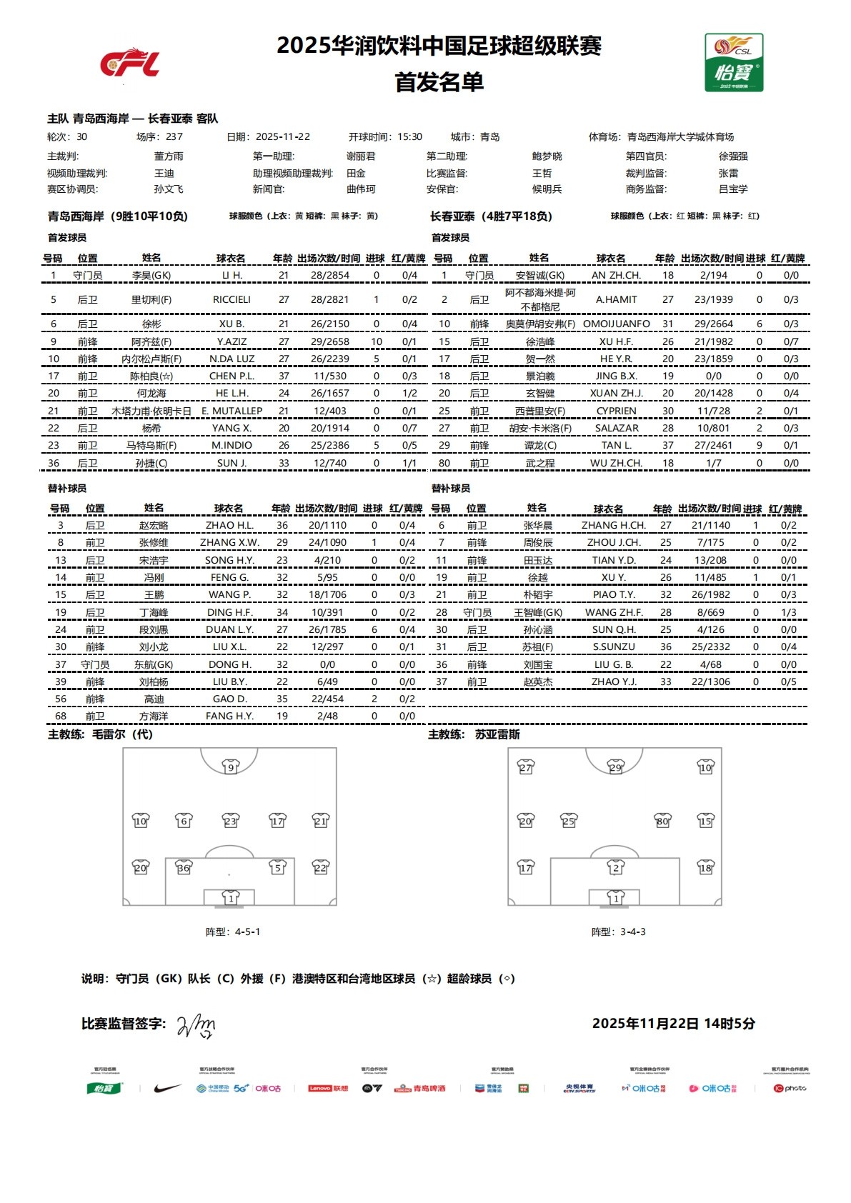 北京时间11月22日15:30,中超 第30轮,青岛西海岸主场迎战长春亚泰,赛前双方球队首发名单公布如下: 文章导航 河南vs云南:双方均4外援出战,史成龙首发,尹鸿博替补 崩溃边缘,德罗赞:现在国王全队心态非常糟糕,一切都烂透了
