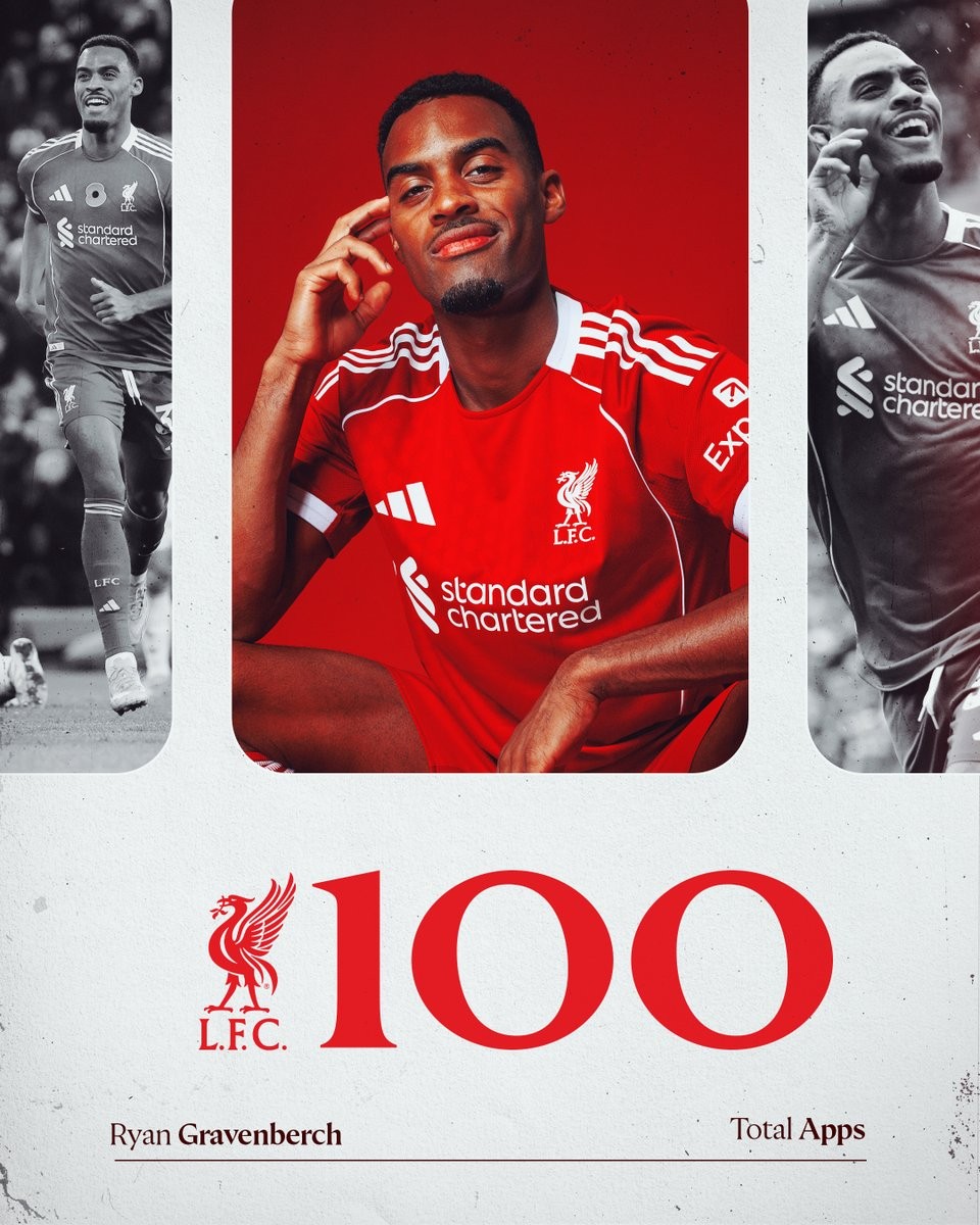 此役主场对阵诺丁汉森林,赫拉芬贝赫首发出战,这位荷兰中场迎来利物浦生涯各项赛事第100次出场。